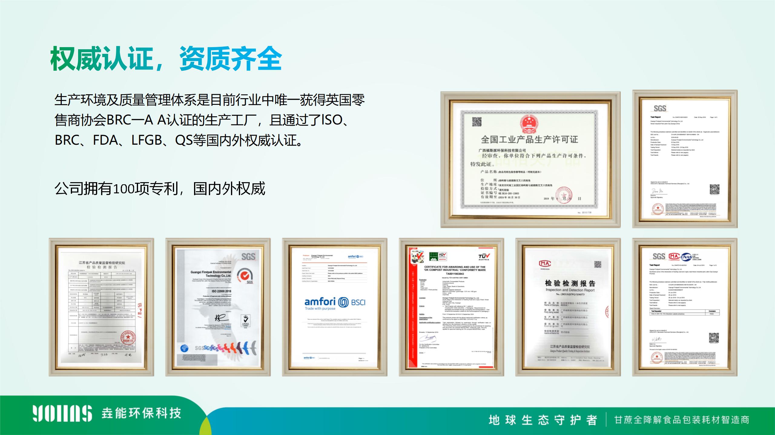 垚能環保科技擁有100項專利,廣西生產基地生產環境及質量管理體系是目前行業中唯一蕕得英國零售商協會BRC一A A認證的生產工廠,且通過了lSO、BRC、FDA、LFGB、QS等國內外權威認證。生產基地總占地600畝,總投資將達到22億,每年產值將達到50多億。