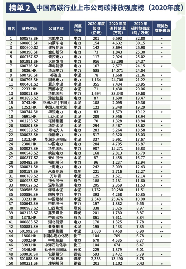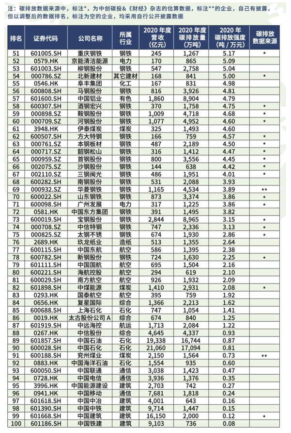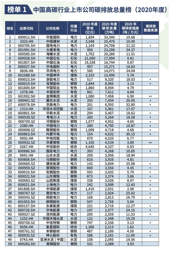 該榜單按照A股和港股上市的公司,在2020年直接或者間接排放的二氧化碳總量進行排序,以及公司每萬元營收產生的二氧化碳排放量進行排序;從這兩 個維度發(fā)布的總量和強度兩個榜單。