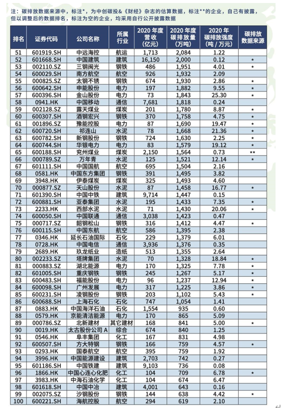 在榜單中,石化、化工、建材、鋼鐵、有色、造紙、電力、航空為八大重點高耗能行業(yè),涵蓋了在A股和港股上市的100家高碳排放公司。 值得注意的是,2020年度中國二氧化碳排放總量約為99億噸,而上榜的100家上市公司,二氧化碳排放總量合計44.24億噸,占全國總量約44.7%。可見這 100家上市公司在中國碳排放總量的比重非常高,強度也是很大。
